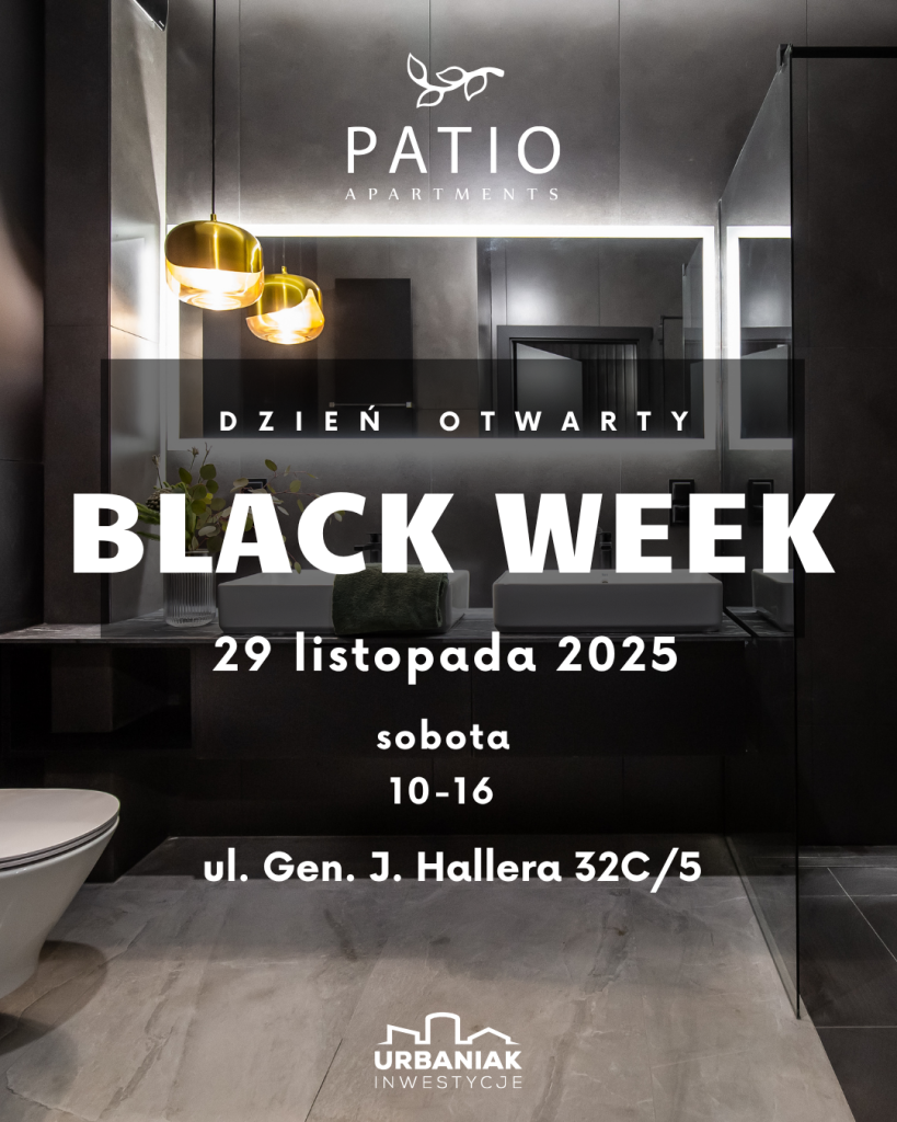 Black Week w Patio Apartments – 29 listopada – to nie tylko wyjątkowe promocje, ale także szansa, by zobaczyć, czym wyróżnia się styl i jakość marki Urbaniak Inwestycje. Mieszkania w specjalnych cenach, rabaty na wybrane lokale oraz możliwość obejrzenia gotowych, w pełni wyposażonych wnętrz to tylko część tego, co przygotowano na ten dzień.
