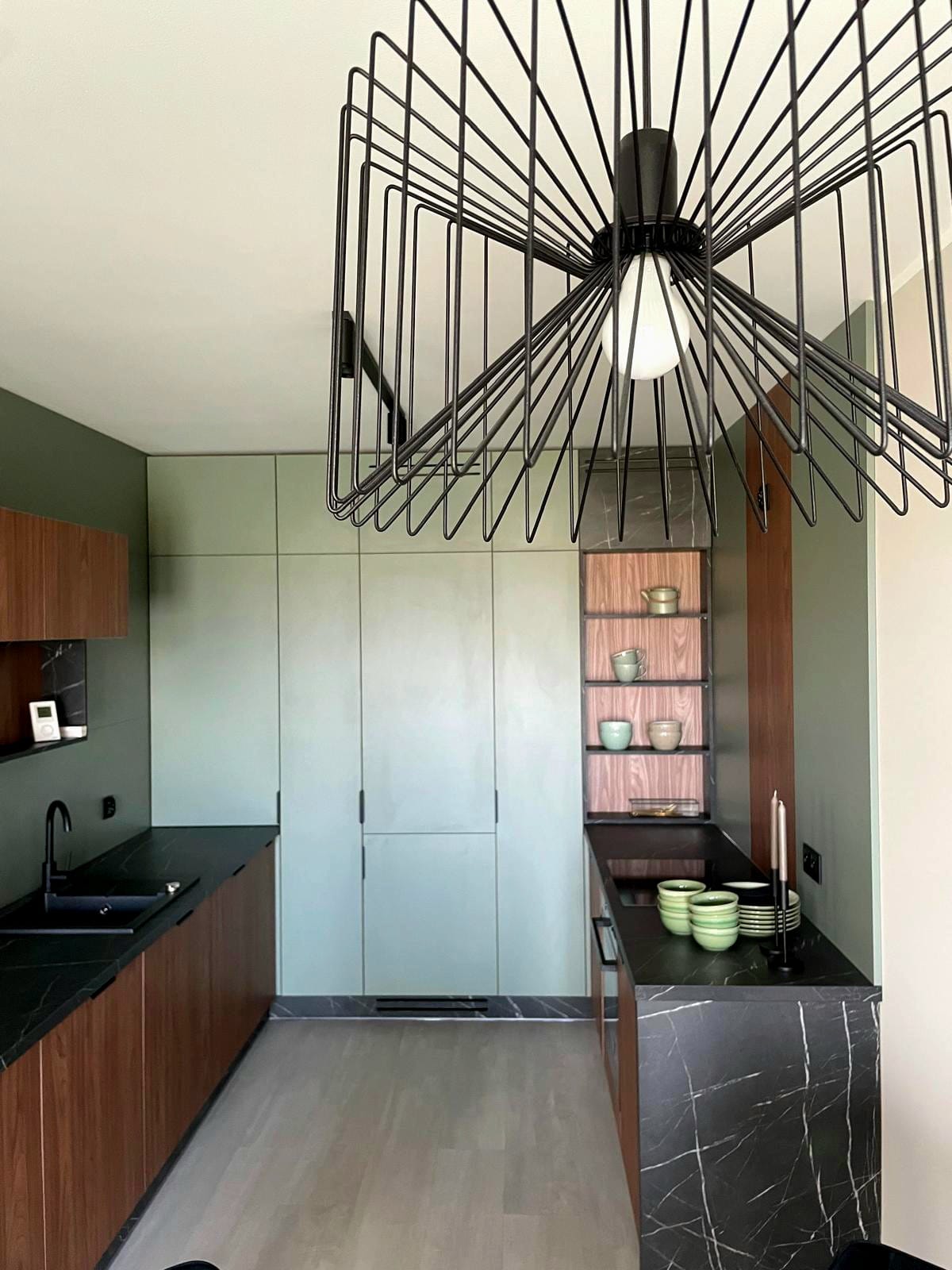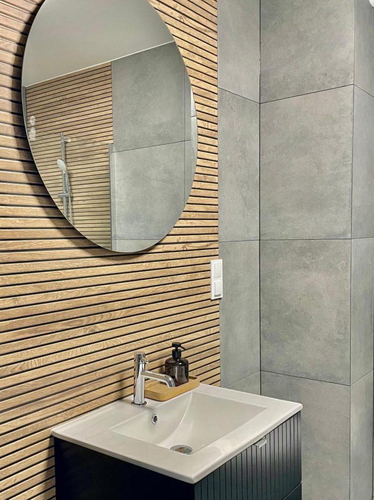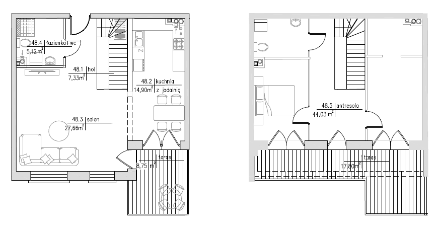 Na III piętrze znajduje się przestronna strefa życia codziennego – salon z aneksem kuchennym i wyjściem na taras, który naturalnie przedłuża przestrzeń i sprzyja codziennemu wypoczynkowi. Na tym poziomie zaprojektowano również komfortową łazienkę. Na antresolę prowadzą drewniane schody. Górna część mieszkania pełni funkcję prywatnej strefy – mieszczą się tu dwie wygodne sypialnie, w tym jedna z garderobą. Uzupełnieniem tej przestrzeni jest dodatkowa toaleta oraz wydzielone miejsce na pralkę, zapewniające maksymalną wygodę codziennego użytkowania.