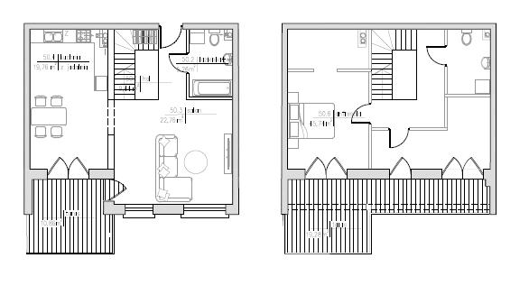 Na III piętrze znajduje się jasny, przestronny salon z wydzielonym aneksem kuchennym oraz strefą jadalnianą, tworzące spójną i komfortową przestrzeń do życia. Na tym poziomie zaprojektowano również łazienkę. Na antresolę prowadzą drewniane schody, które podkreślają charakter wnętrza. Górna kondygnacja stanowi strefę prywatną – mieści się tu sypialnia z garderobą, gabinet oraz łazienka z prysznicem typu walk-in.